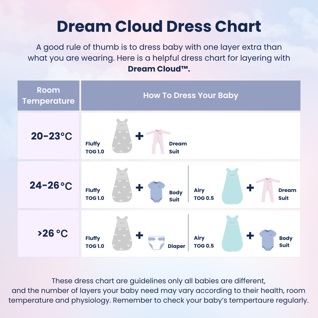 TOG adalah singkatan dari "Thermal Overall Grade". TOG adalah ukuran tingkat kehangatan kain, yang menilai kemampuan insulasi termalnya. TOG menunjukkan seberapa hangat kain akan menjaga tubuh, semakin tinggi tingkat TOG, akan semakin hangat. TOG adalah panduan parents untuk memilih sleepsack yang tepat sesuai dengan suhu lingkungan, agar memastikan Si Kecil tidur dengan nyaman dan aman. Rekomendasi TOG dan suhu ruang dapat dilihat pada dressing chart diatas.